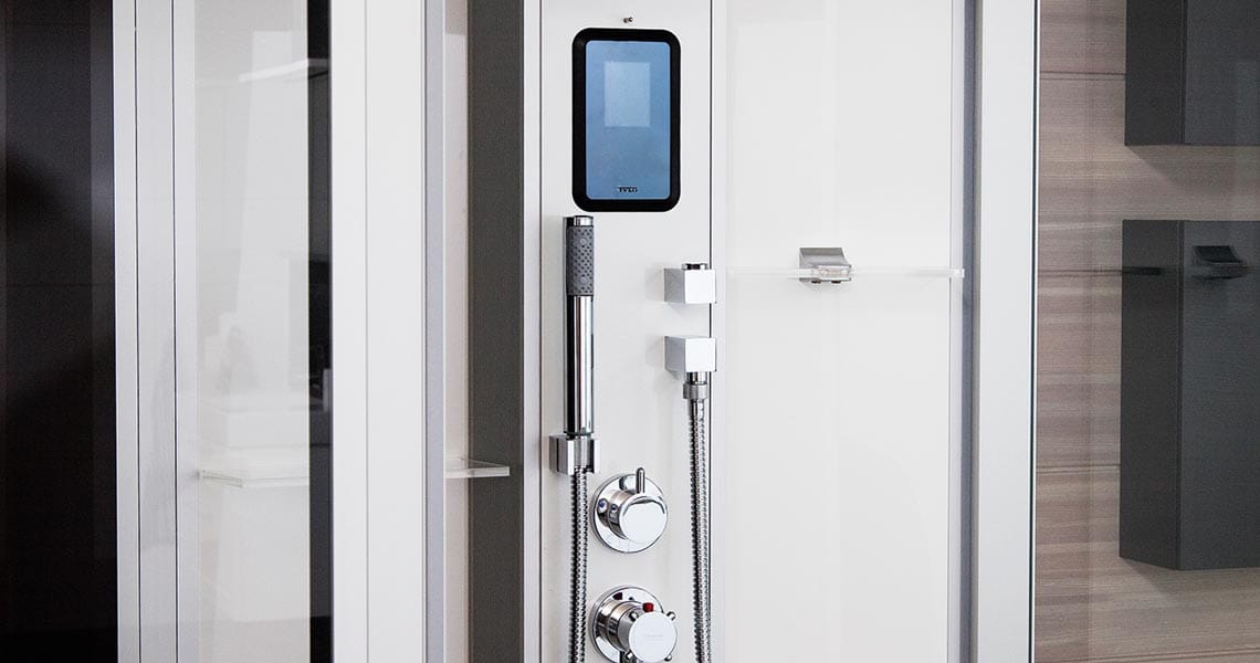 The Tylo steam generator has a de-scaling point on the column. As a result, there is no need to call an engineer when de-scaling. There are two showers, a hand held and overhead plate deluge shower. Both are controlled from the steam column which also has manual switching between the showers, speed of flow and temperature control.