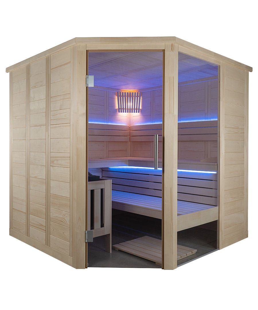The Alaska Corner from Harvia is a space-smart corner sauna, with two glass sides and premium lime-wood comfort.