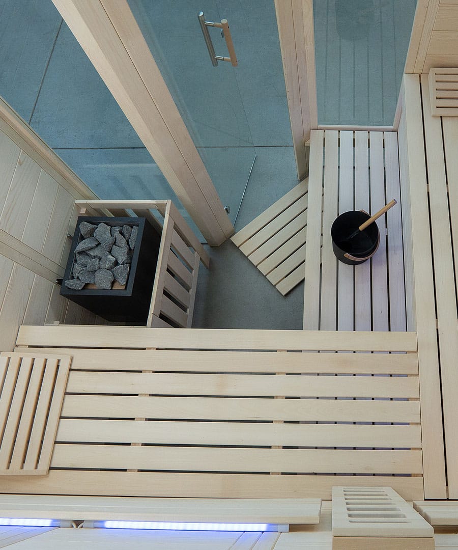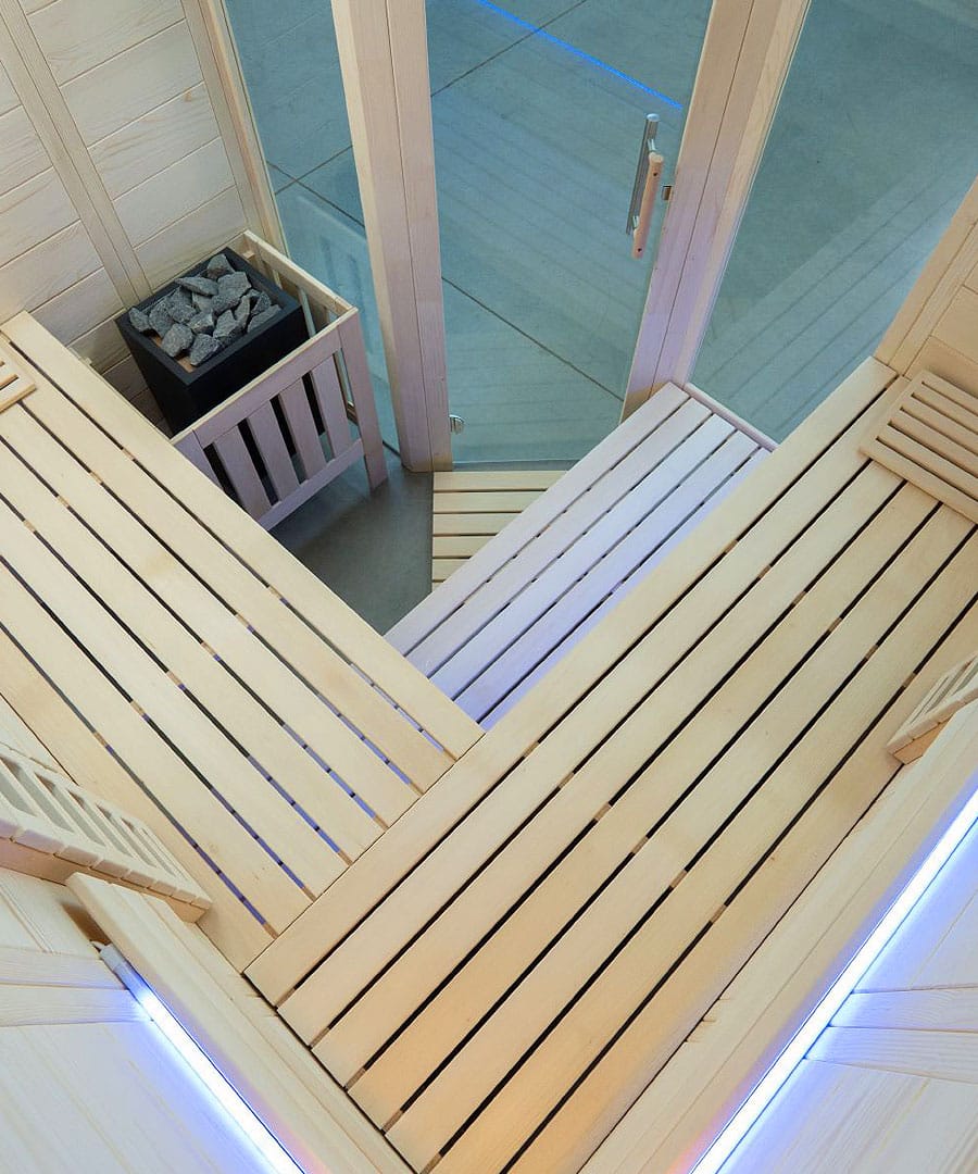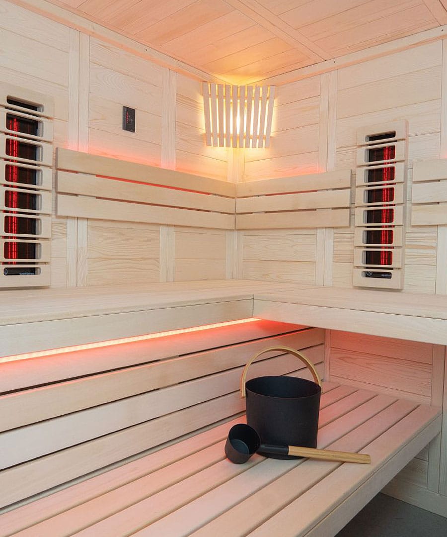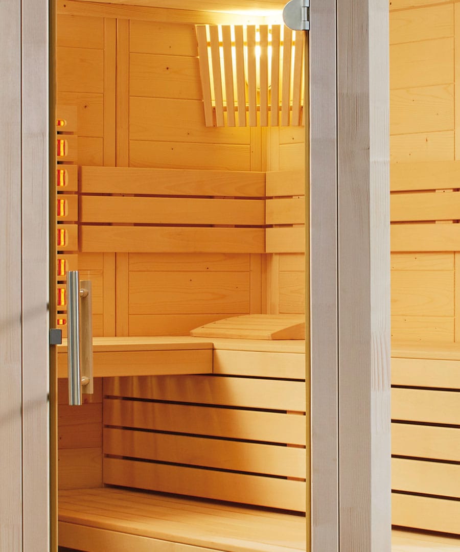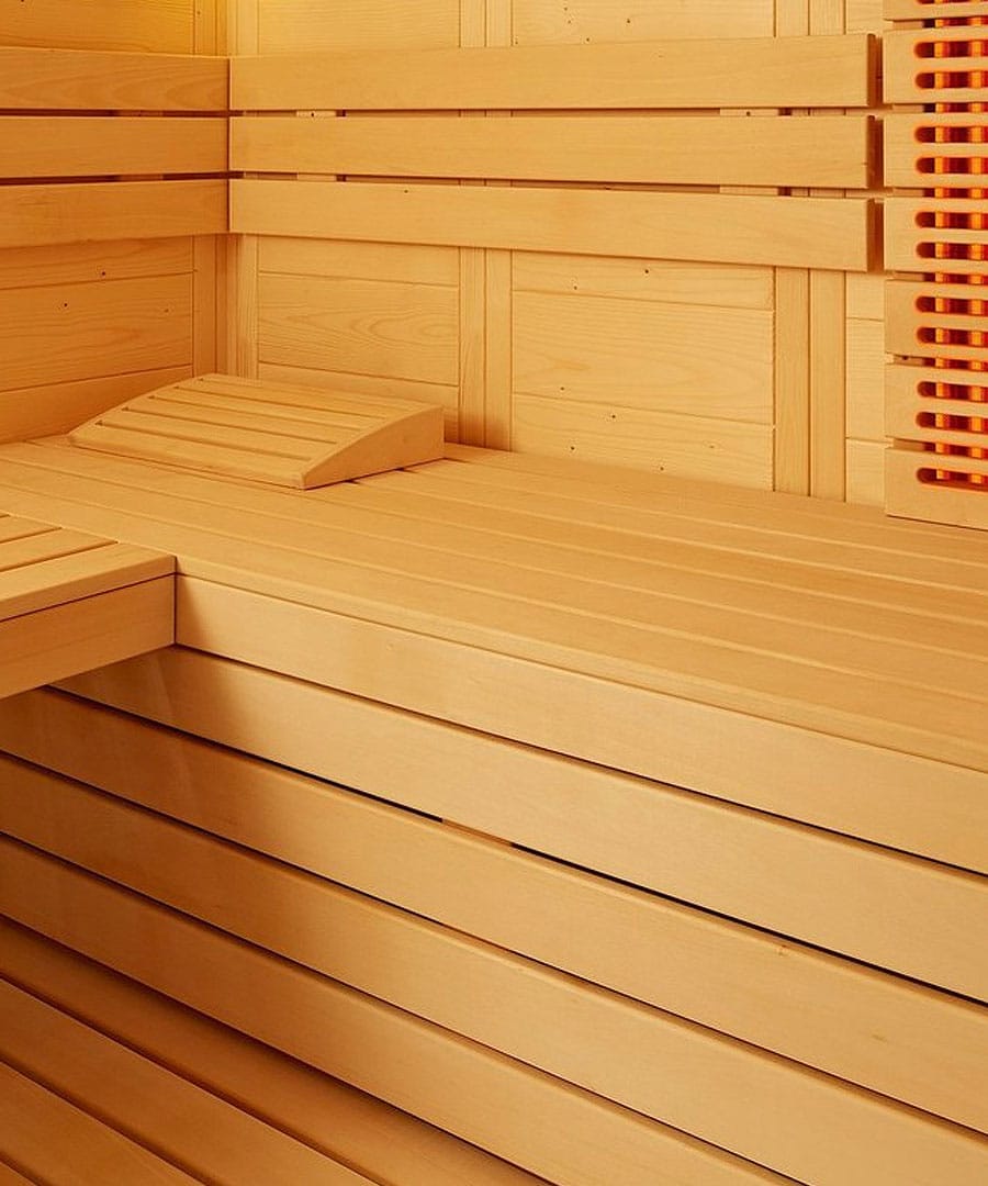 Inside, the three-bench layout gives comfortable seating for up to five. Backrests, headrests and a floor grid add to the overall sense of quality. Two integrated full-spectrum infrared radiators bring extra flexibility to the experience. As a result, the cabin is just as appealing for a quick recovery session as it is for a longer traditional routine.