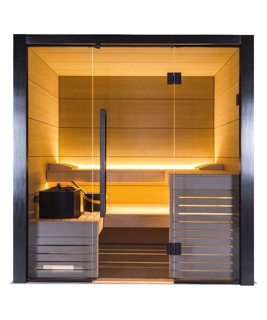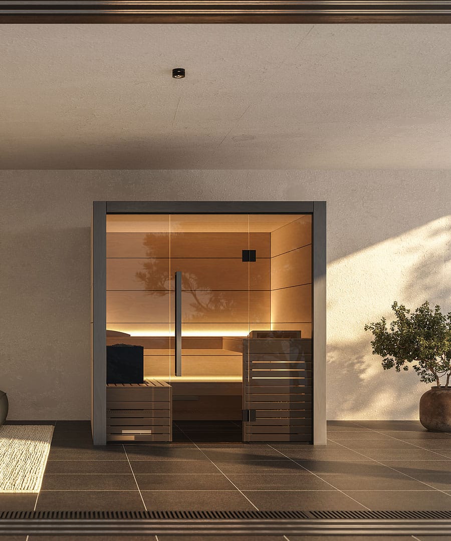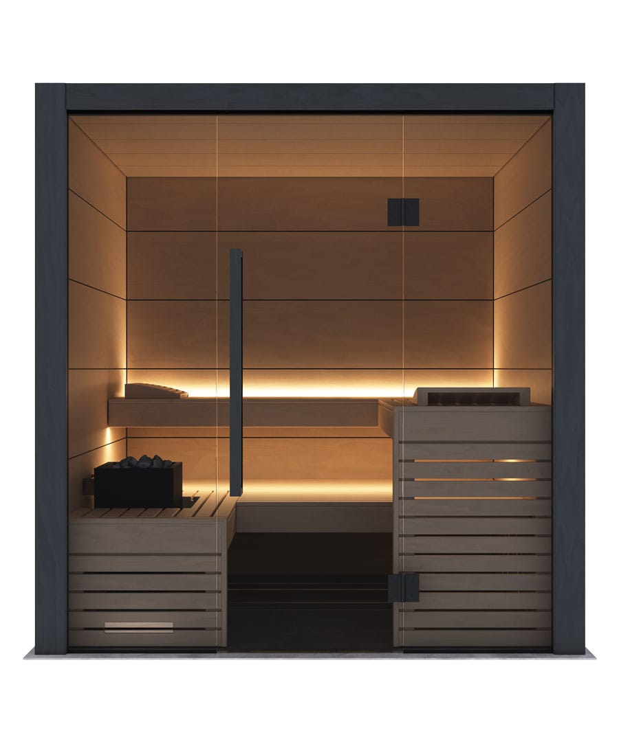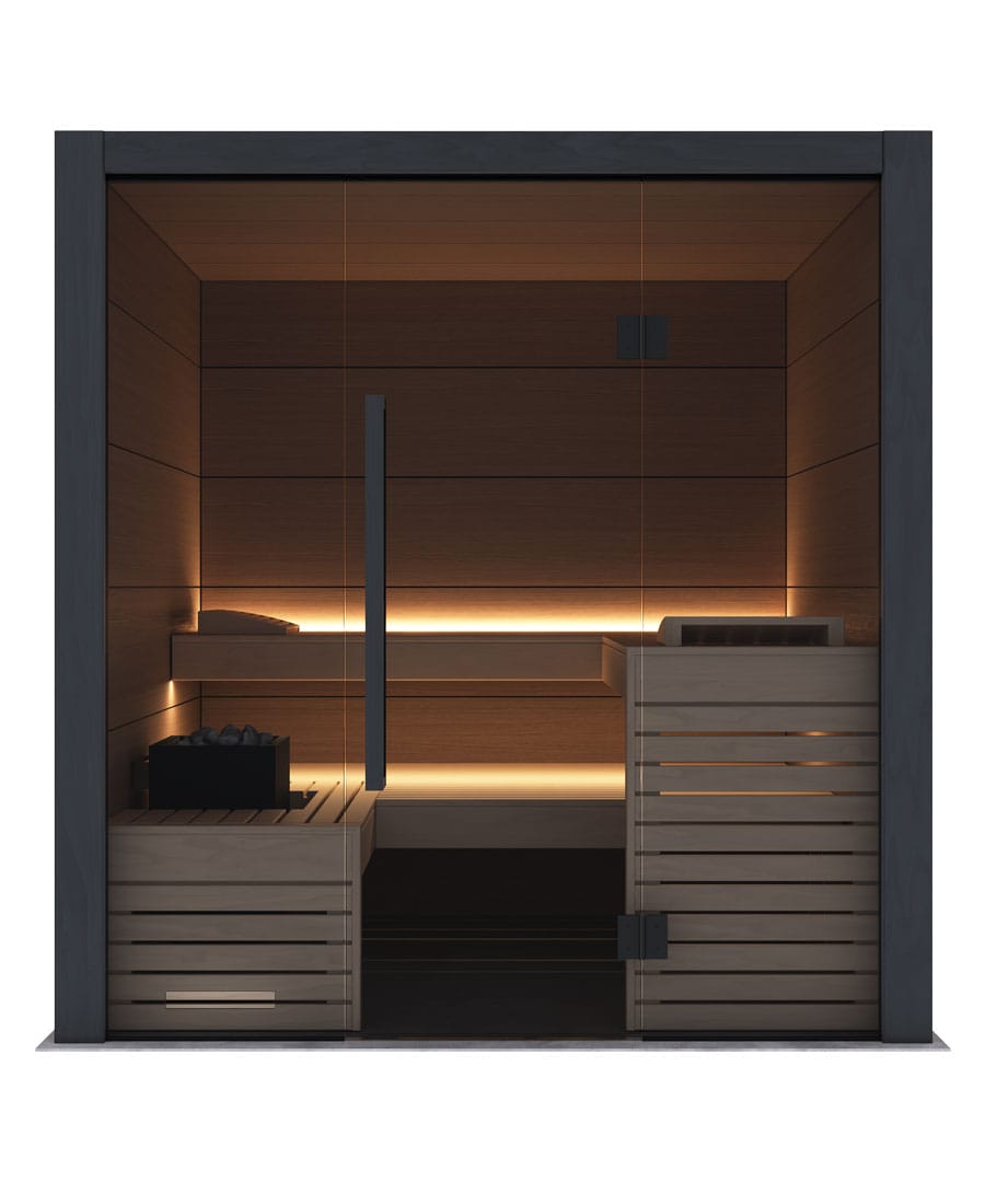 - Full grey glass front: For a brighter, more open feel that gives the sauna real presence.