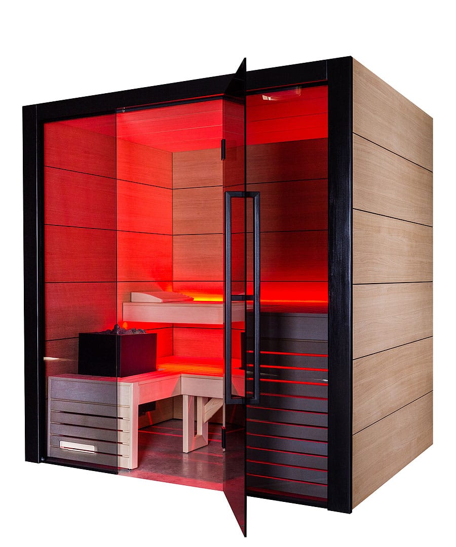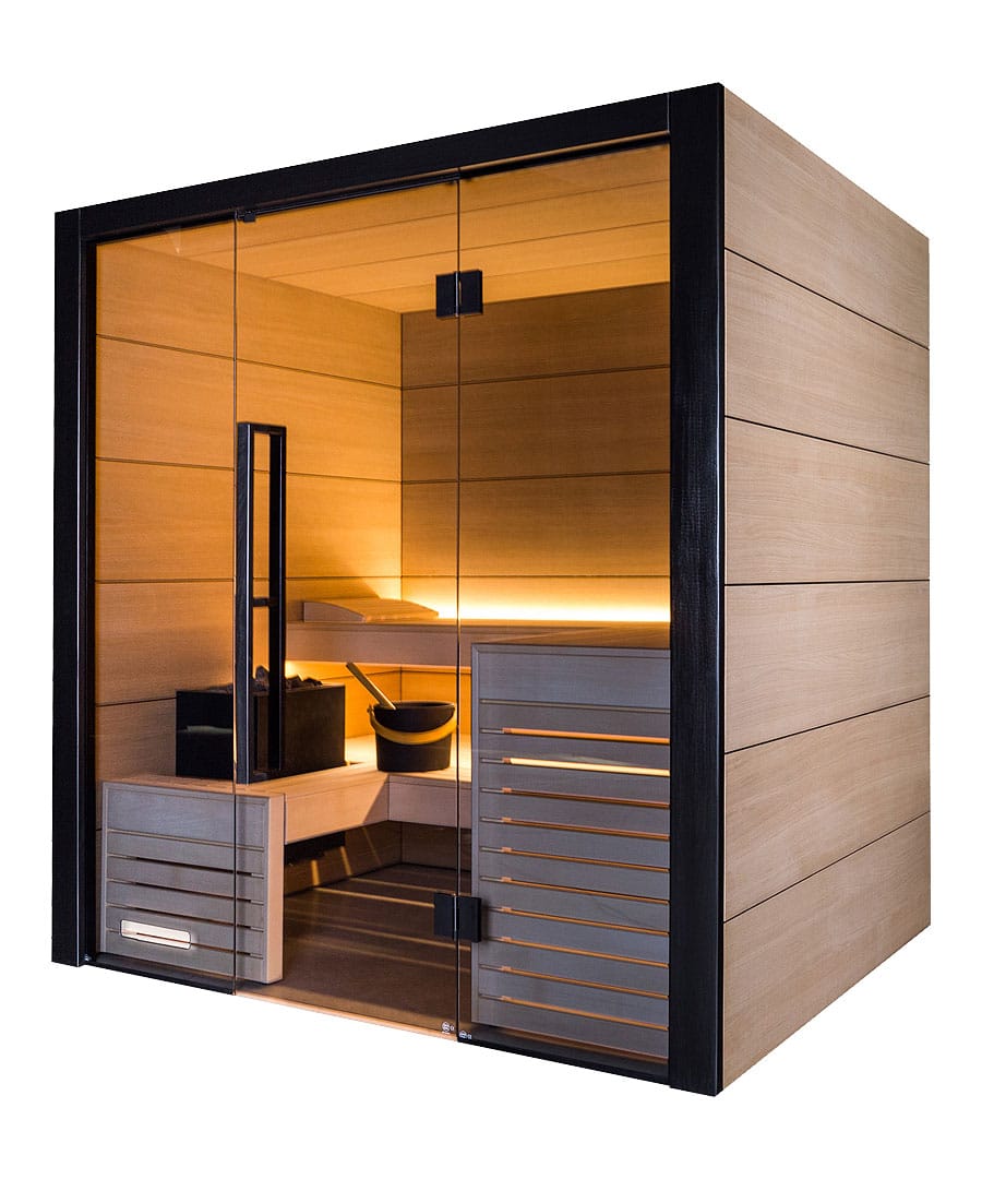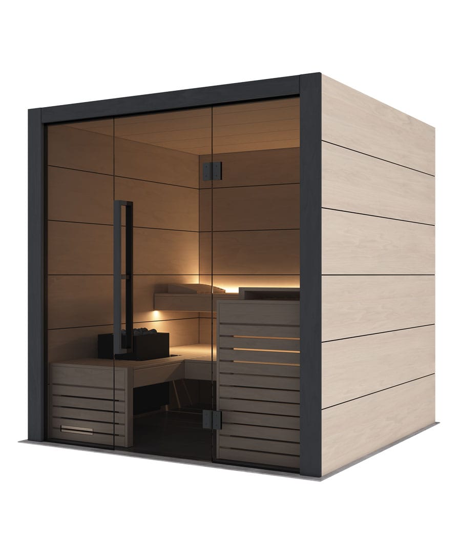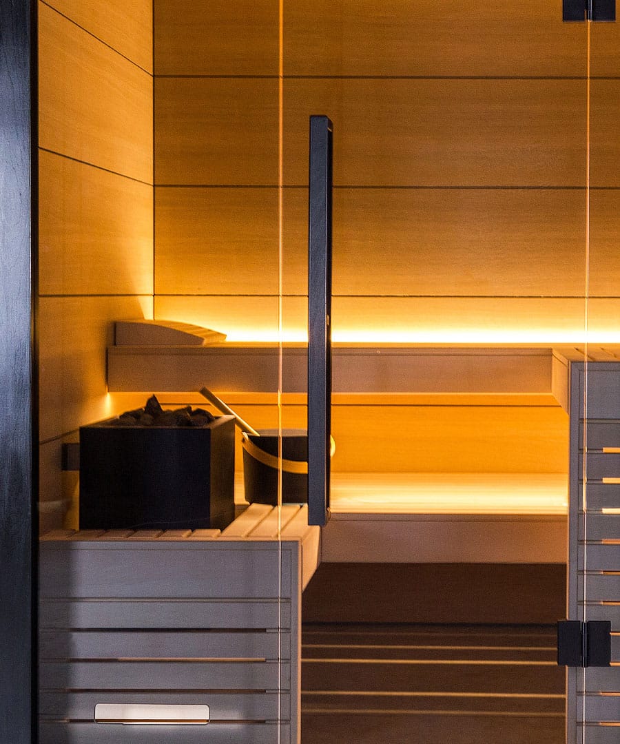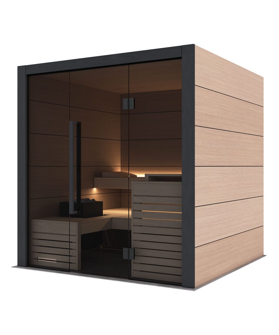 - Full grey glass front: For a brighter, more open feel that gives the sauna real presence.