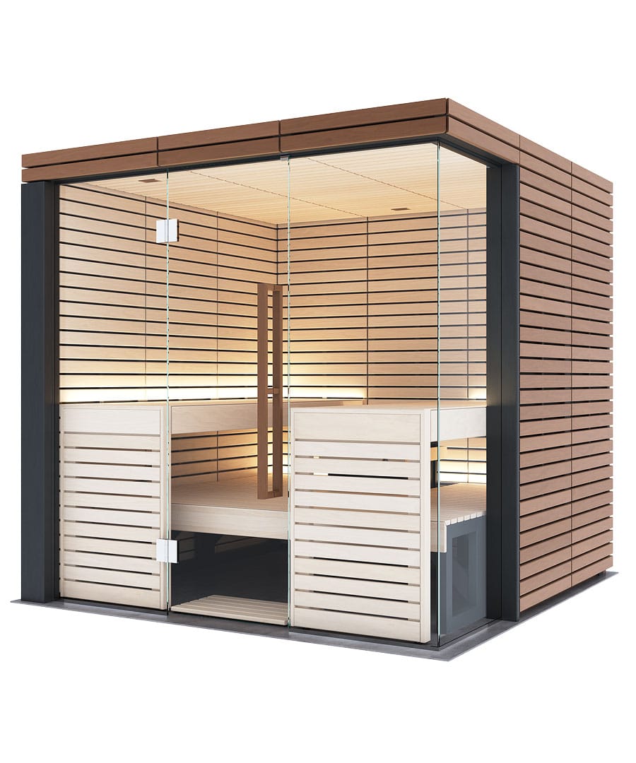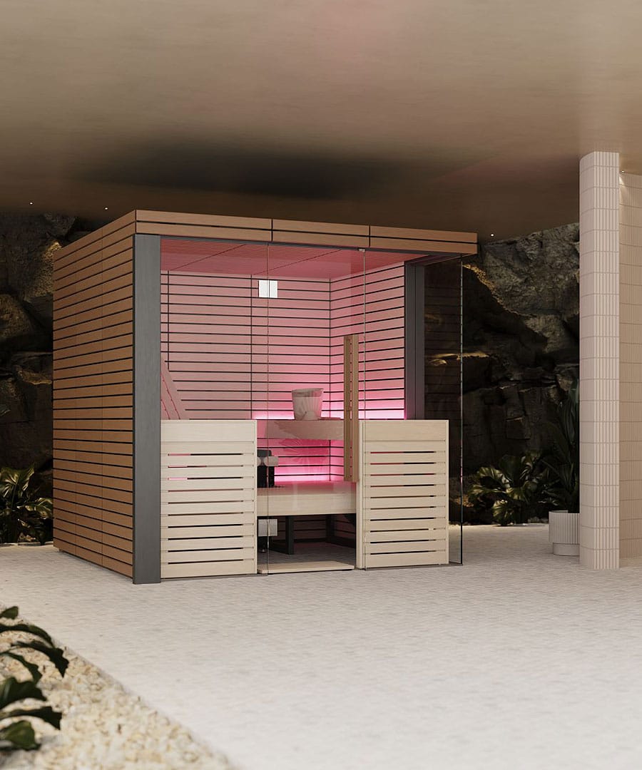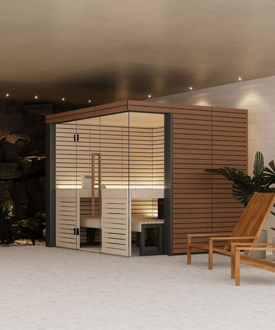 - Premium timber finish: The sauna cabin combines thermo-lime exterior cladding with a premium internal finish in lime wood.
