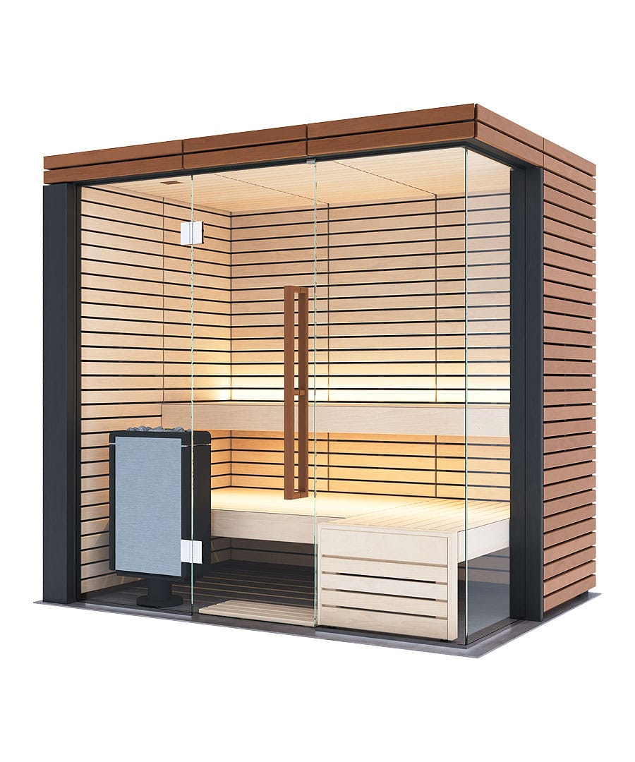 - Premium wood finish: The sauna cabin combines thermo-lime exterior cladding with a premium linden interior finish in lime wood.