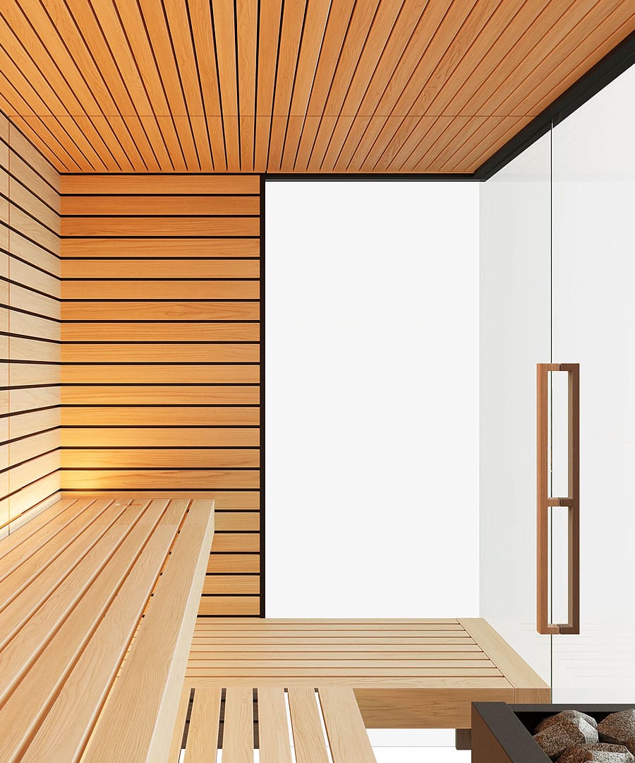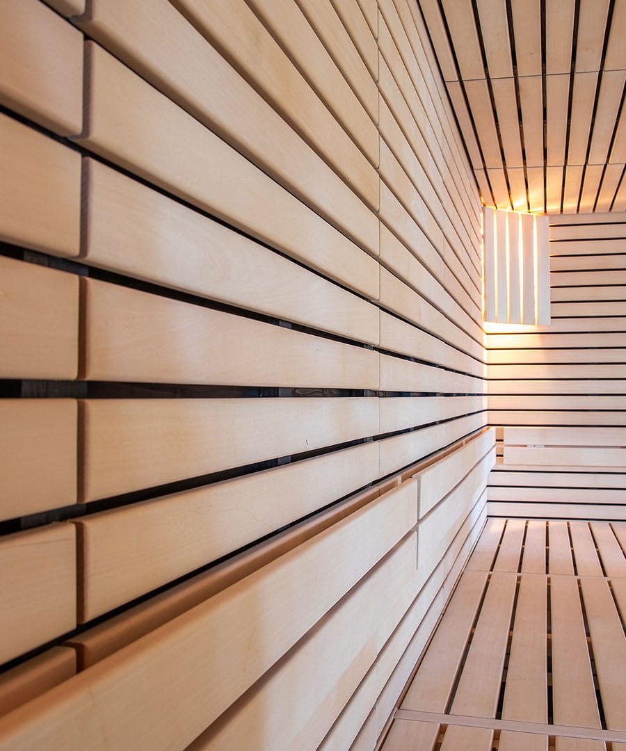 Inside, the layout has been handled with intelligence and care. The wide upper bench includes a unique adjustable backrest that can be raised or lowered back into the bench. Lower benching adds comfort and flexibility without cluttering the space. Natural linden bring a smooth, refined finish to the interior and stay pleasant against the skin, even when temperature picks up.