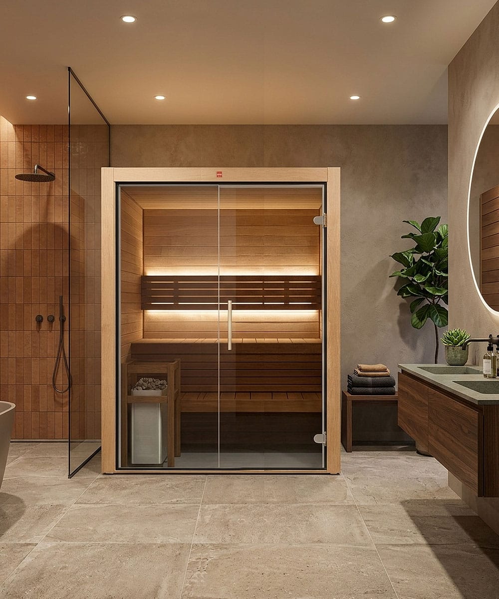 - Full glass front: A bronzed 8mm tempered glass door creates an open, architectural look that gives the sauna real presence in a high-end interior.
