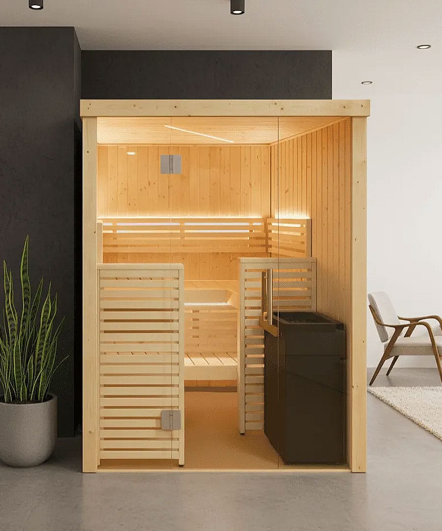 - Glass front: The Variant View Small sauna kit features a complete glass front that provides a more open and spacious feel to the sauna experience. The glass front allows users to have an unobstructed view of the surroundings, which can be especially beneficial if the sauna is located in a scenic or tranquil setting.