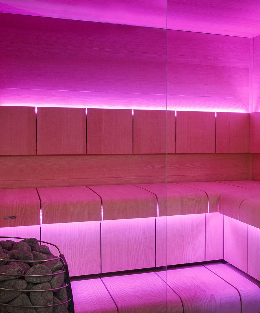 Contoured benches and backrests are sublimely shaped rather than simply fitted. This is a flagship Harvia home sauna, just in a smaller footprint. The full glass front keeps the space open and bright and RGBW LED lighting lets you set the mood. PIR insulation helps the cabin heat efficiently and hold a steady sauna temperature.